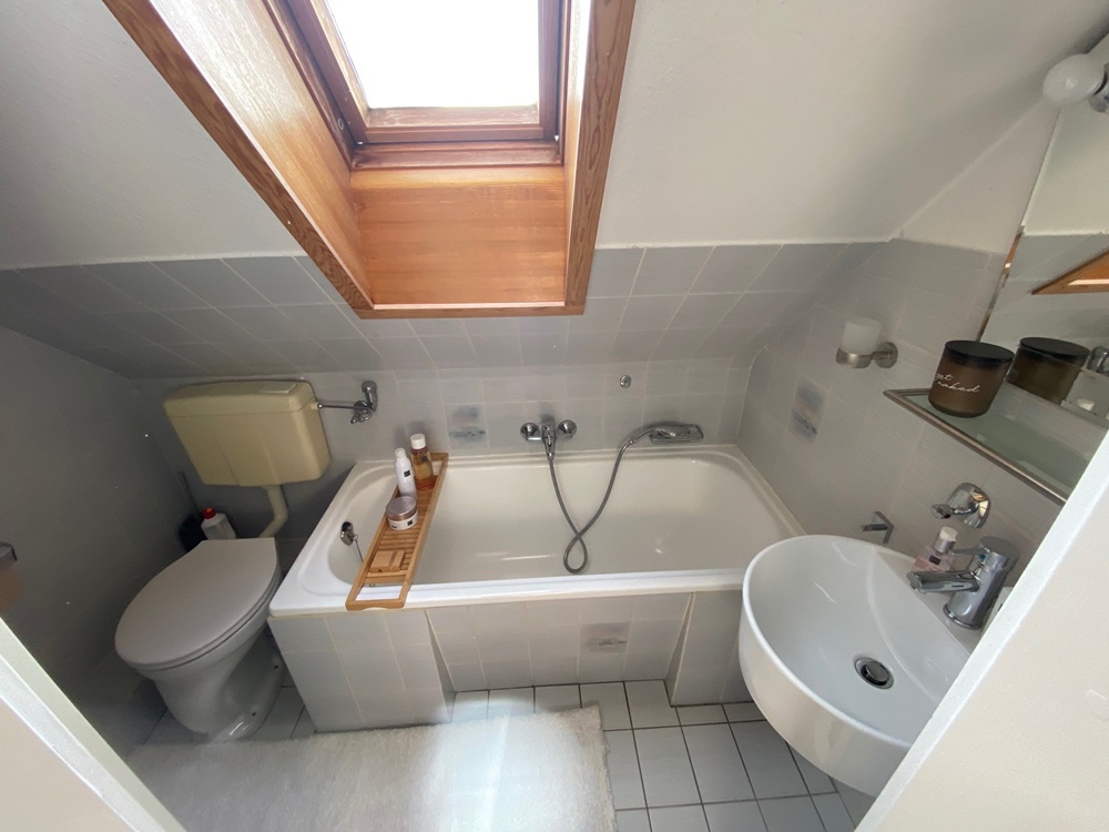 Das Badezimmer im Dachgeschoss ist älteren Datums.