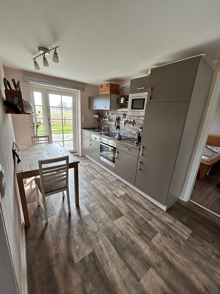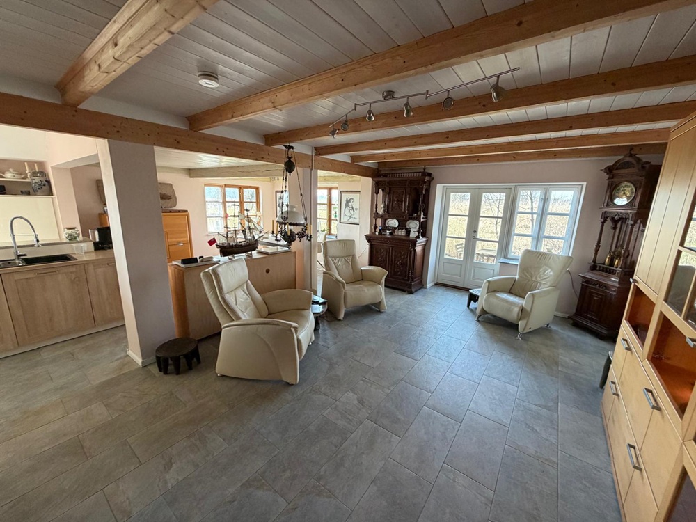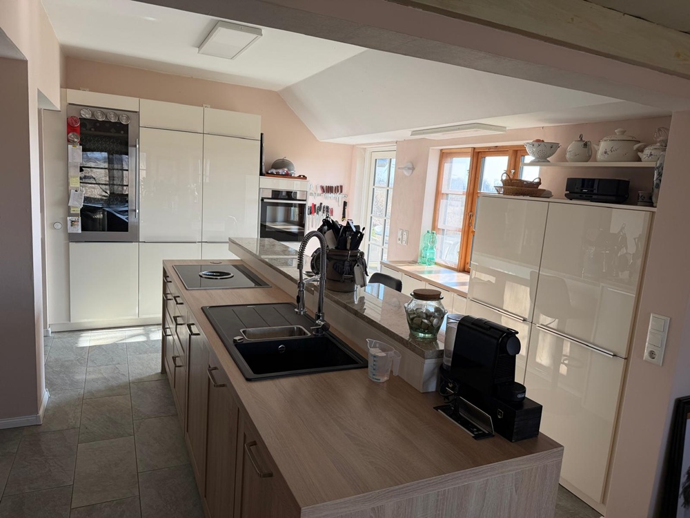 Das Herzstück der Hauptwohnung ist die traumhafte, offene Küche (Global) mit Kochinsel, einem Bora-Kochfeld, Granitsteinplatte und weiteren erstklassigen E-Geräten namhafter Hersteller (Neff, Miele, Liebherr), die jeden Hobbykoch begeistern wird. Der Wohn- und Essbereich schließt sich harmonisch und lichtdurchflutet an. Hier befindet sich auch der wassergeführte Tulikivi-Specksteinofen, an dem Sie es sich an kälteren Tagen gemütlich machen können.