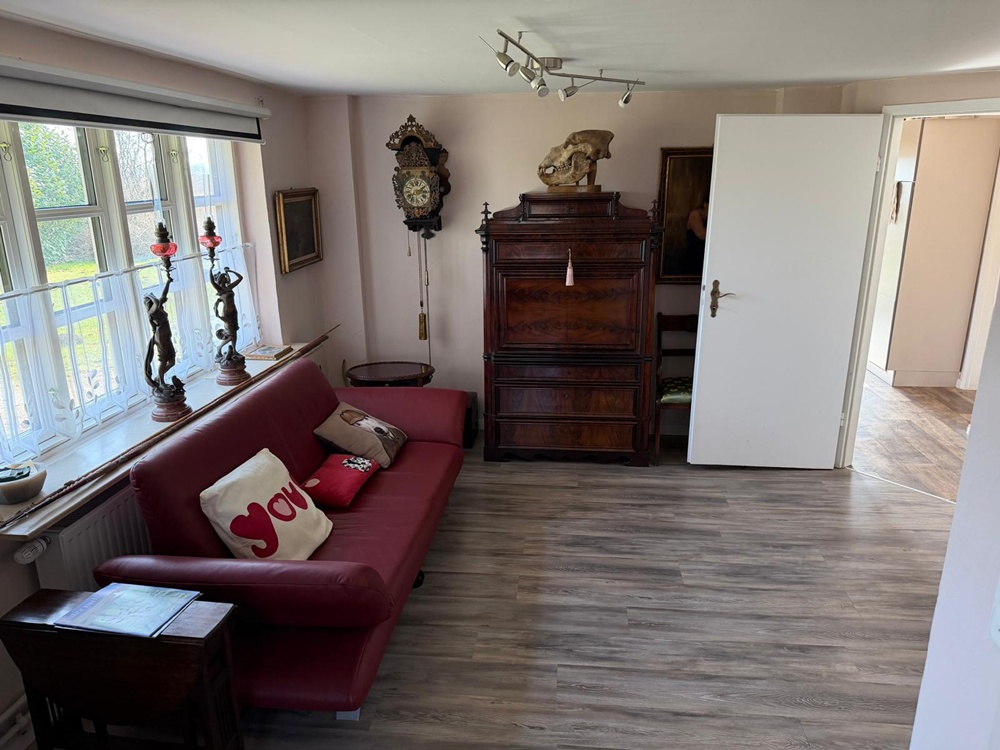 Des weiteren verfügt die Hauptwohnung über ein großzügiges Schlafzimmer, einen originell gestalteten Barraum, ein Büro, ein großes Bad/WC, einen an die Küche angrenzenden Hauswirtschaftsraum sowie die große Diele. Die Sonne genießen Sie entweder auf der nach süd-west ausgerichteten Terrasse oder auf der Terrasse gen Westen.