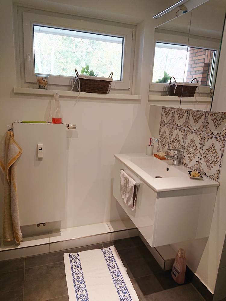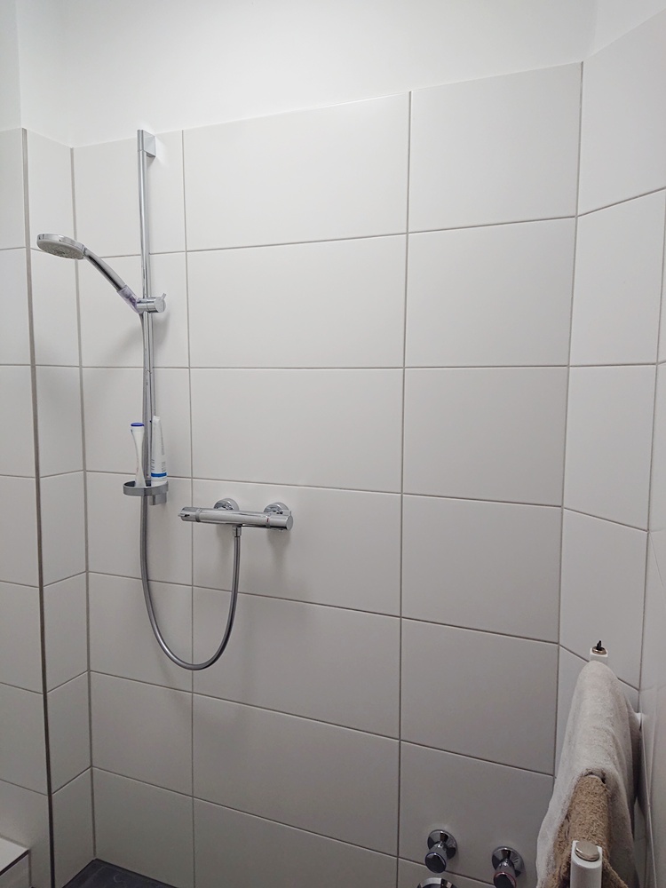 Das Badezimmer wurde 2020/2021 umgebaut und modernisiert. So wurden das vorherige Duschbad und das separate WC zu einem Badezimmer zusammengelegt. Entstanden ist ein modernes Duschbad mit hellen Fliesen und bodengleicher Dusche.