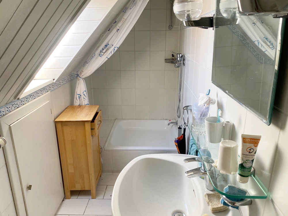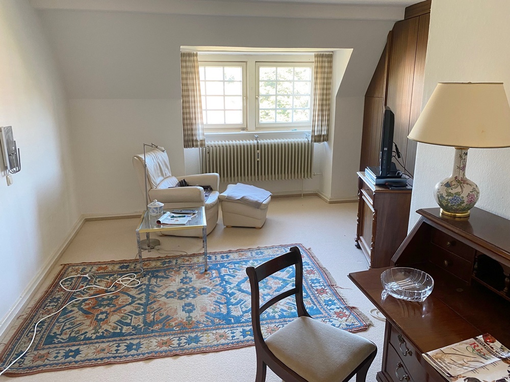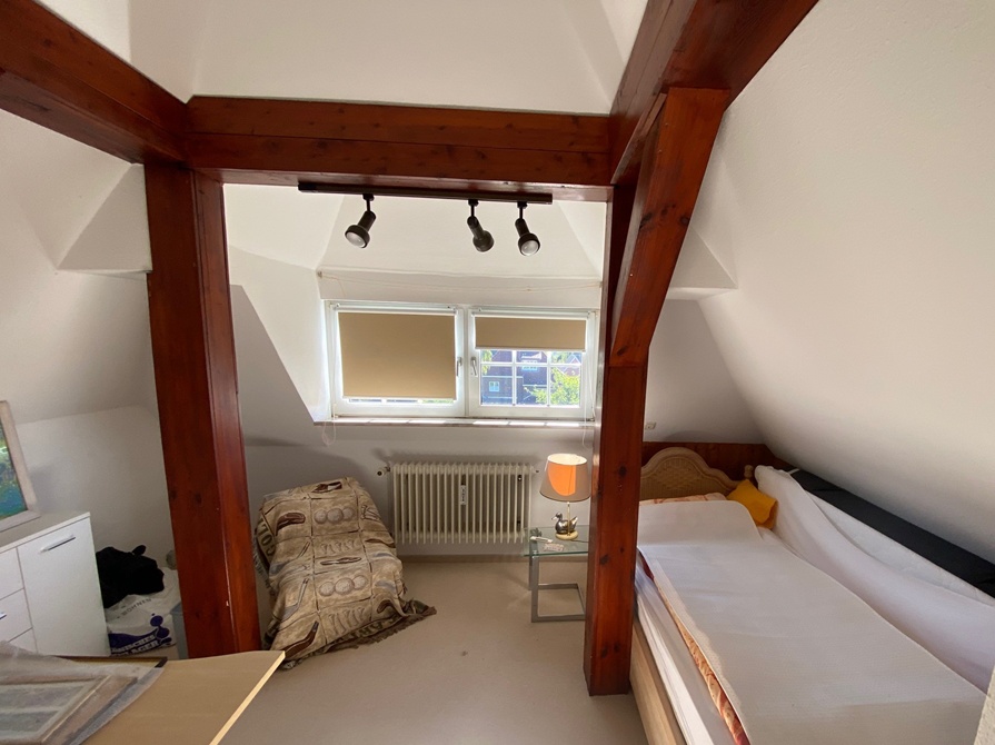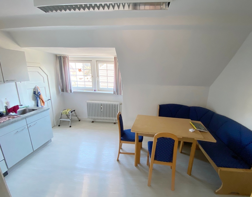 Die kleine 2-Zimmer-Wohnung mit Küche und Dusche/WC im Dachgeschoß kann hervorragend als Rückzugsort für die Mitarbeitenden dienen.