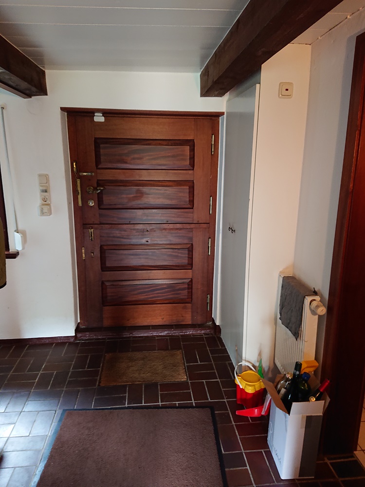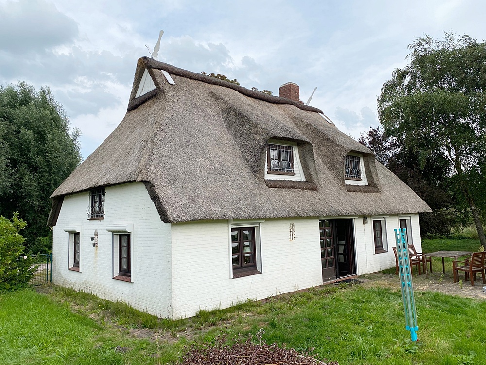 Das Reetdach wurde zur Deichseite ca. 2014 komplett erneuert inklusive der Gauben und dem First, die Straßenseite wurde seinerzeit ausgebessert. Aktuell wurde der Dachfirst noch einmal umfangreich ausgebessert und die Straßenseite gepflegt.